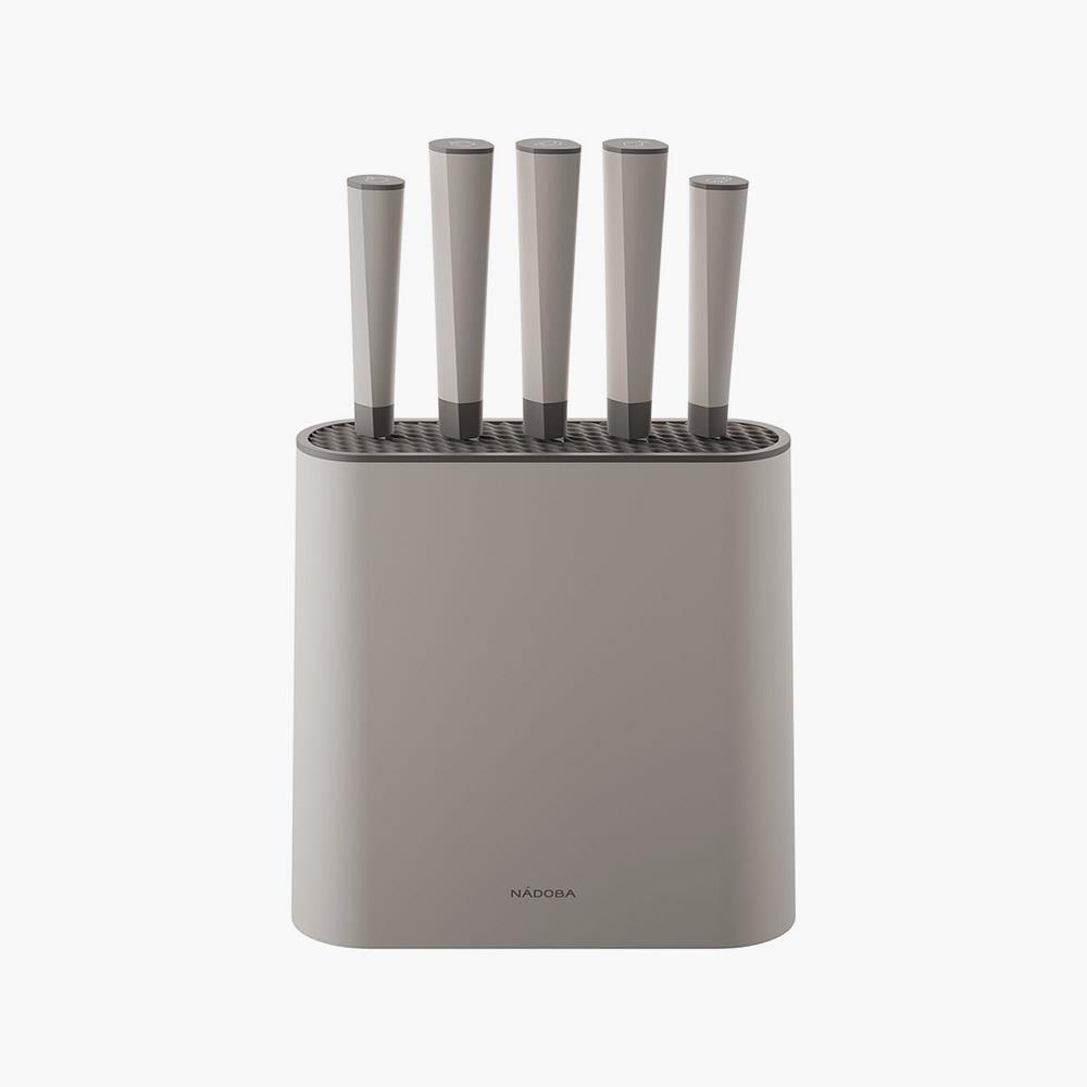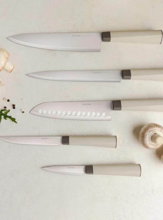 Нож для овощей 9 см, нож универсальный 12,5 см, нож Сантоку 17,5 см, нож разделочный 20 см, нож поварской 20 см, подставка